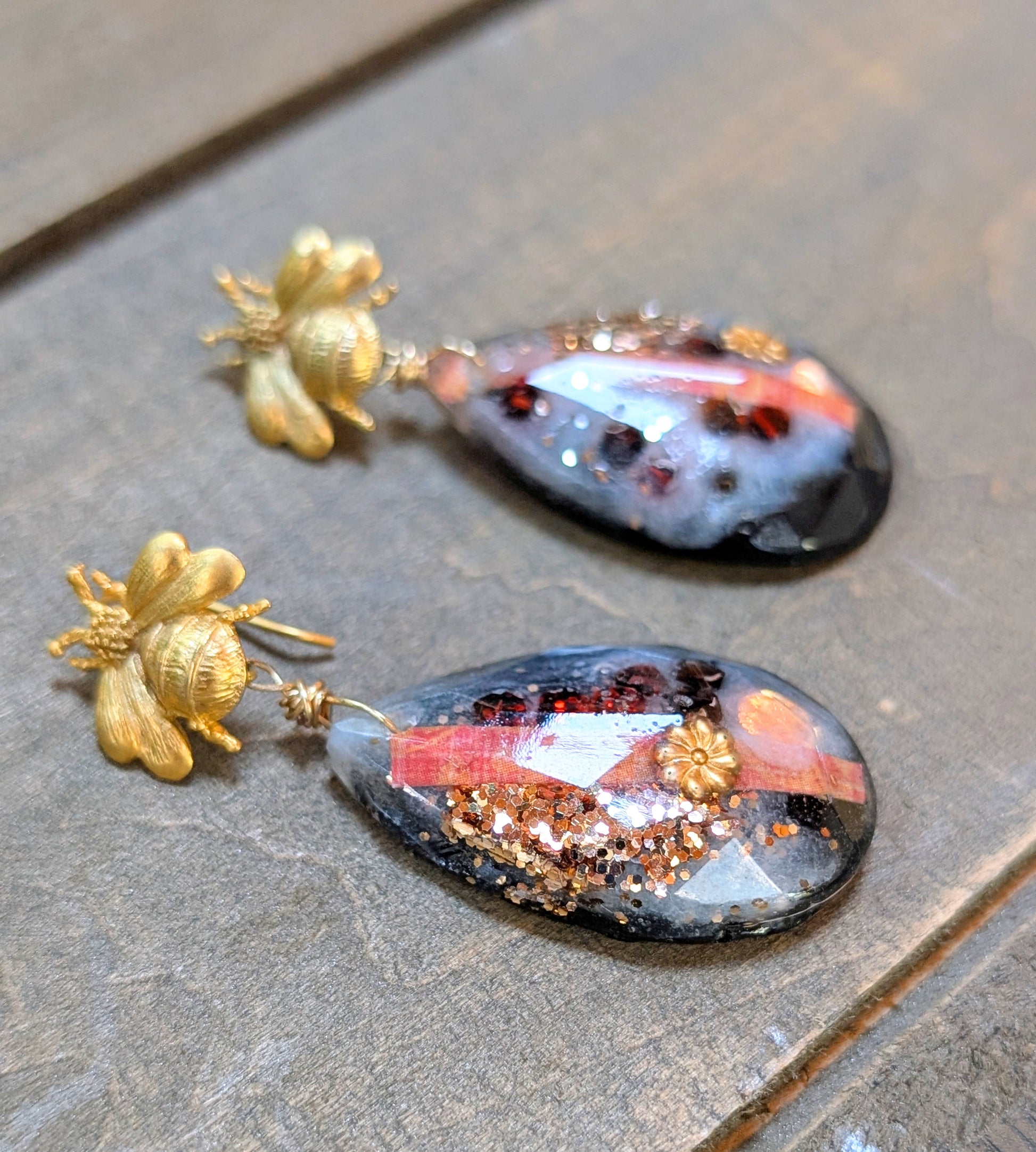 I made this pair of statement earrings with faceted resin "crystals" (I made silicone molds of vintage chandelier crystals), filled with bits of upcycled paper, tiny vintage brass flowers, gold glitter, and topaz beads, backed with black resin and finished off with matte, gold plated bee ear wires.