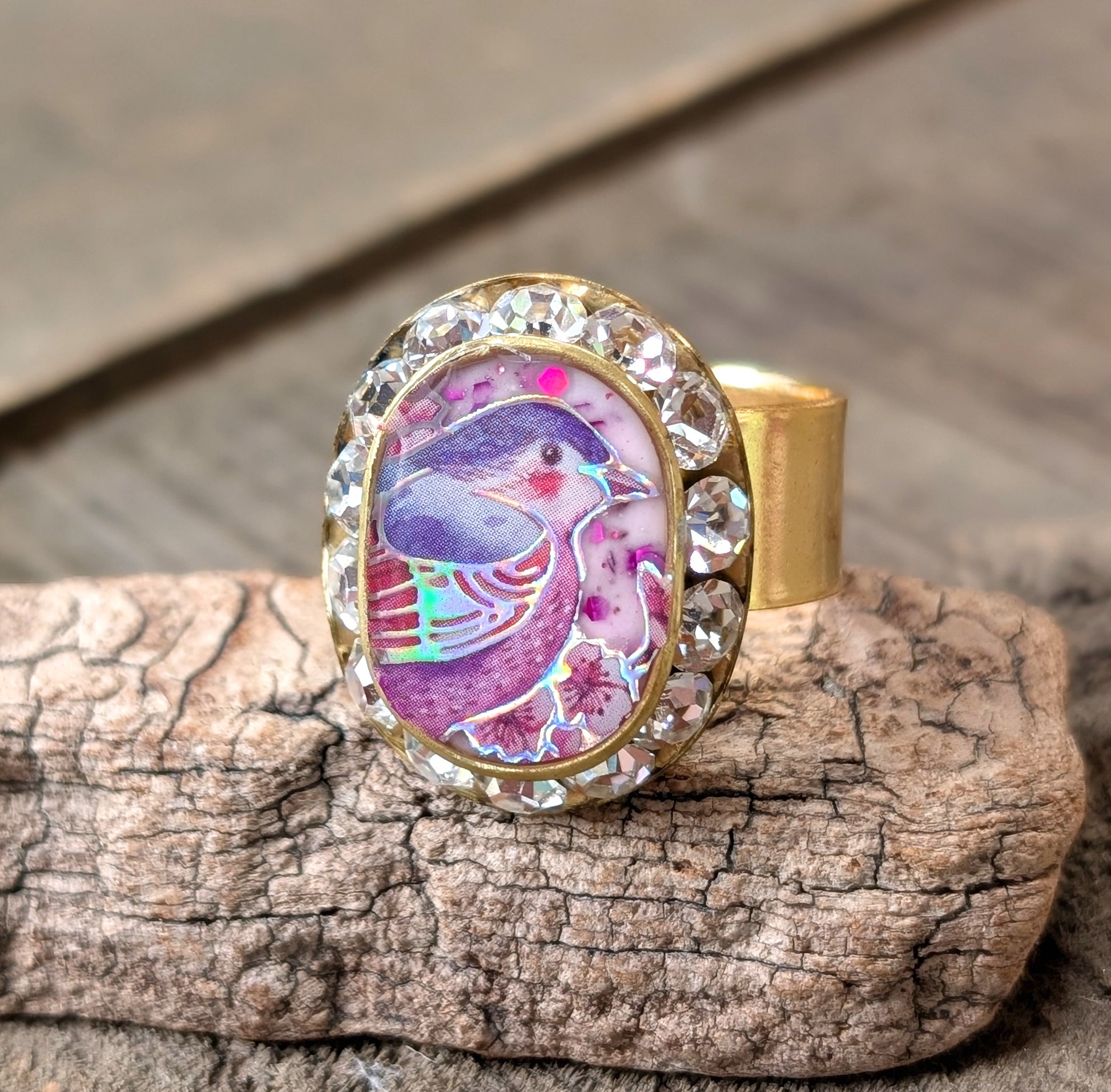 I've added ceramic resin in a pink glitter color along with an iridescent bird decal into a vintage rhinestone bezel. The bezel sits atop a wide, gold plated ring blank.