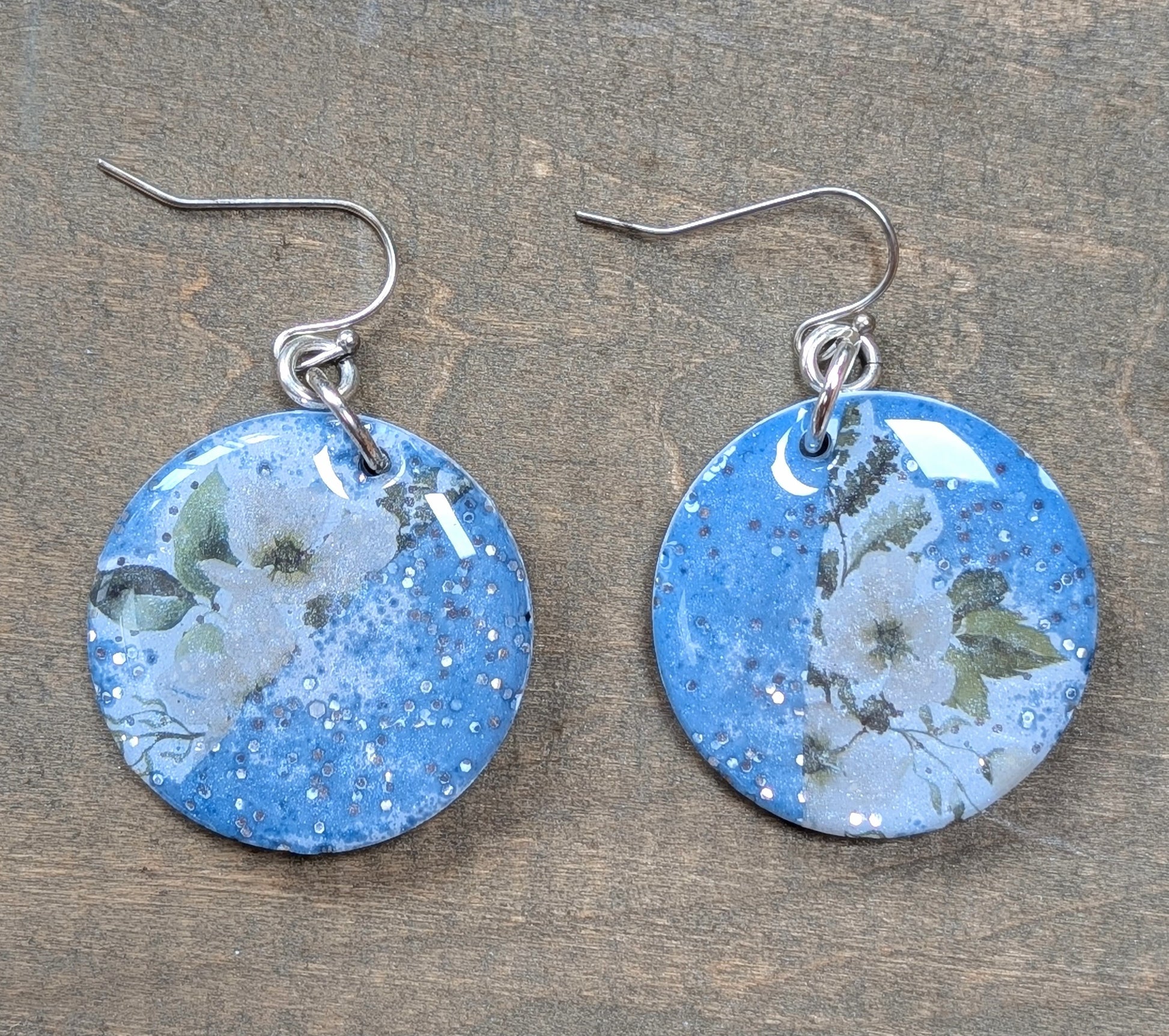 These circular earrings feature a faded denim blue background, embedded with tiny bits of silver glitter, overlaid with translucent shimmery white, embellished with floral decals, and topped with a shiny coat of clear resin.
