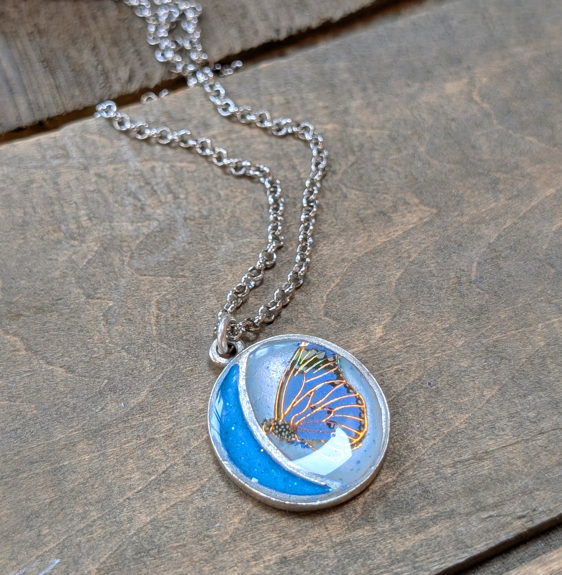 This necklace features a moon shaped pendant with a blue crescent moon and a silvery blue background embellished with a shimmery butterfly decal. Strung on an antiqued silver plated chain.