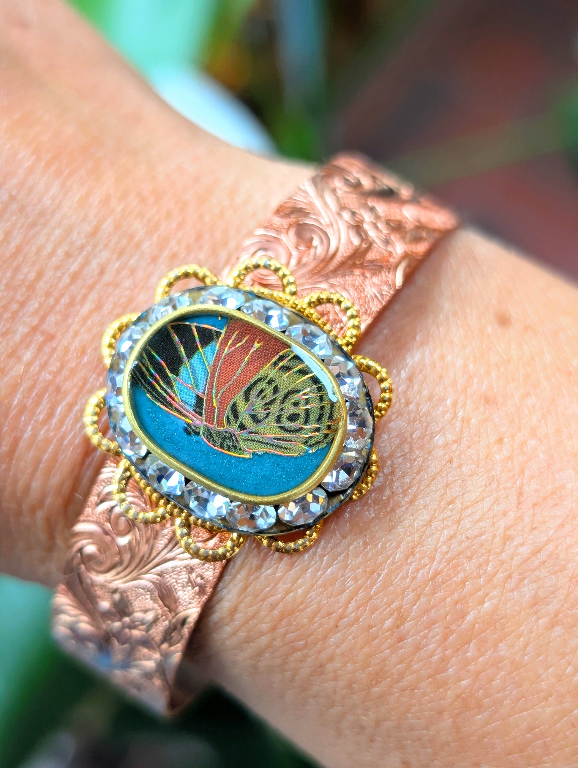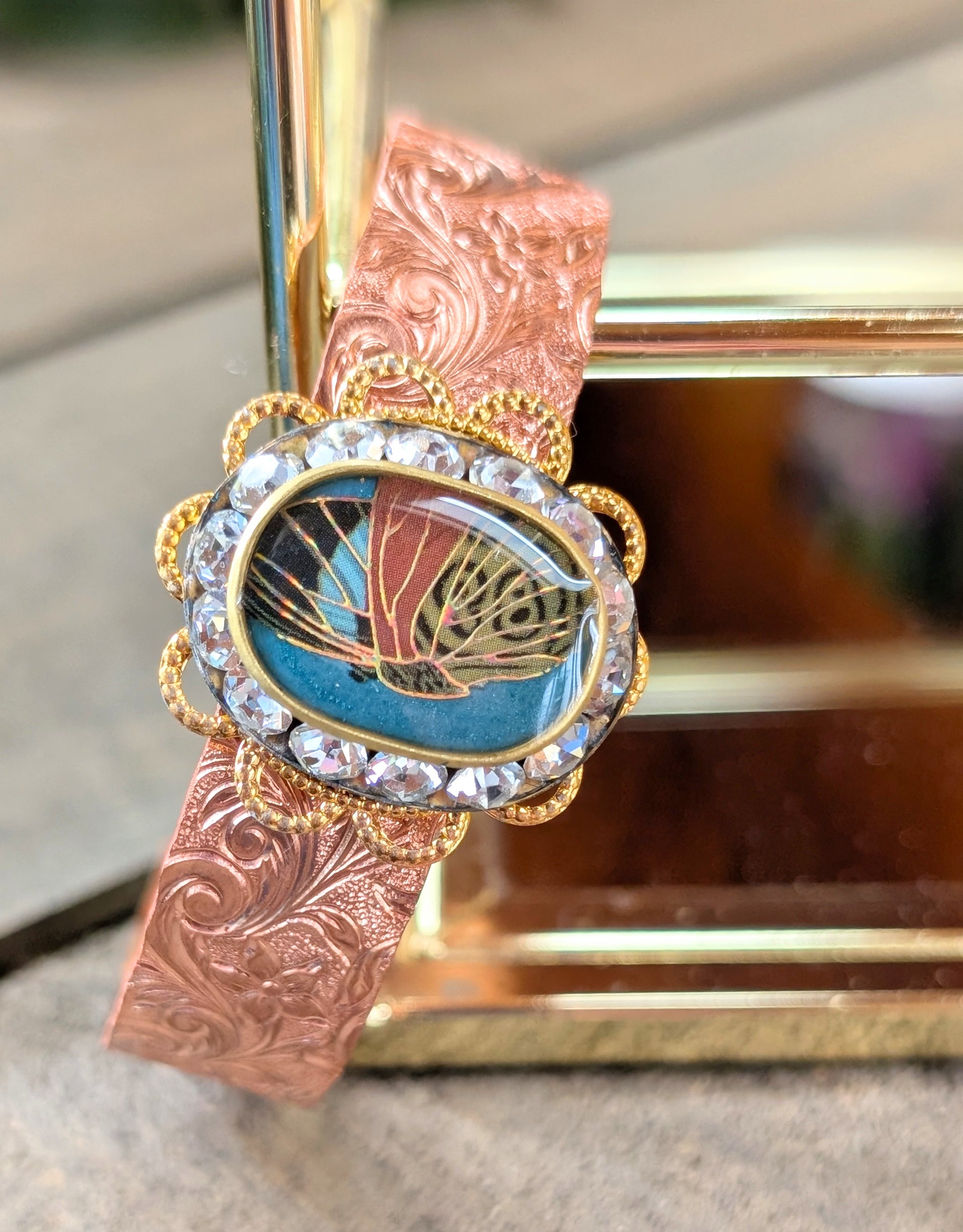 I've added ceramic resin in a dark turquoise color along with an iridescent butterfly decal into a vintage rhinestone bezel. The bezel sits atop a vintage, etched copper cuff bracelet.