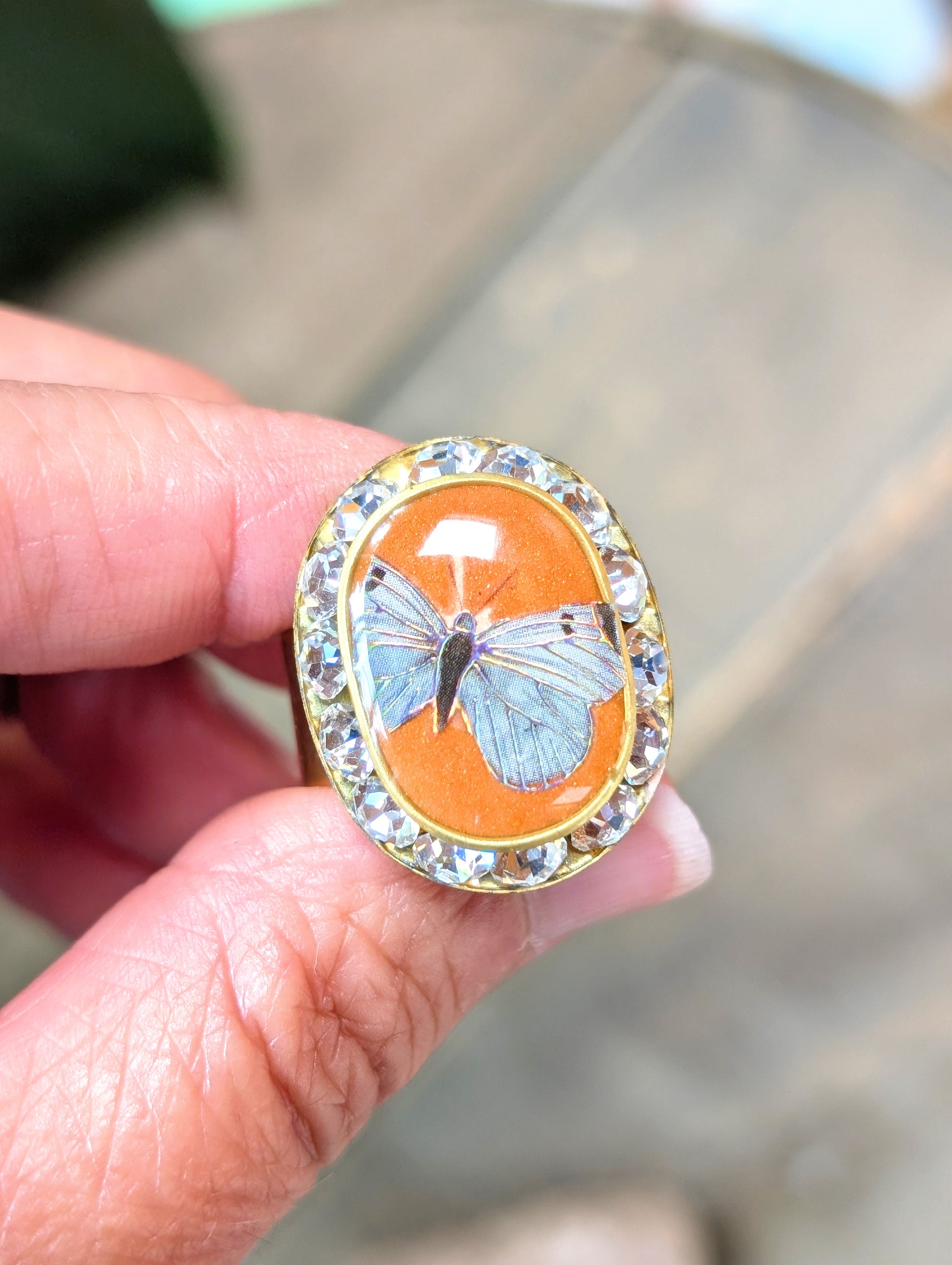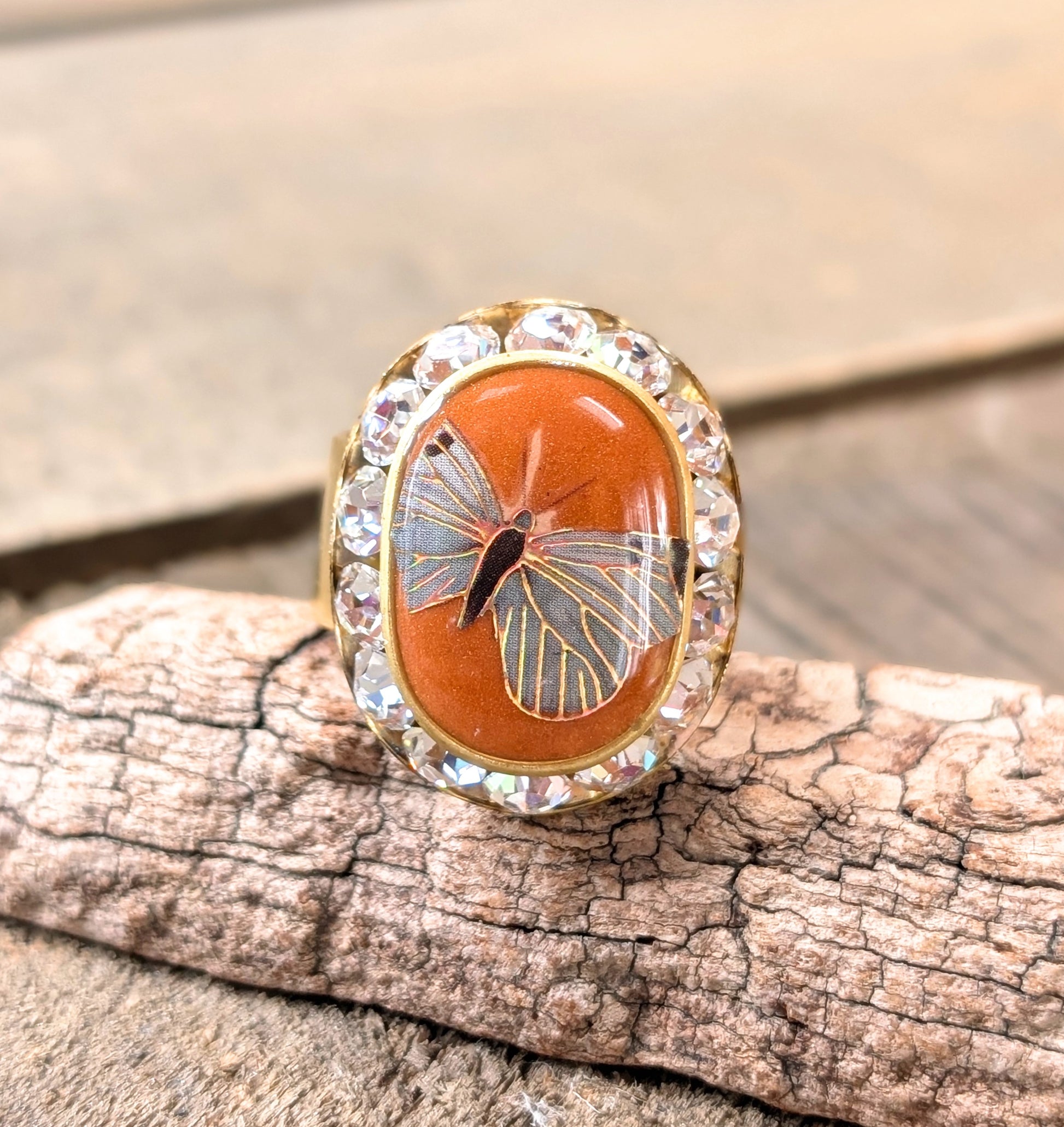 I've added ceramic resin in a pumpkin orange color along with an iridescent butterfly decal into a vintage rhinestone bezel. The bezel sits atop a wide, gold plated ring blank.