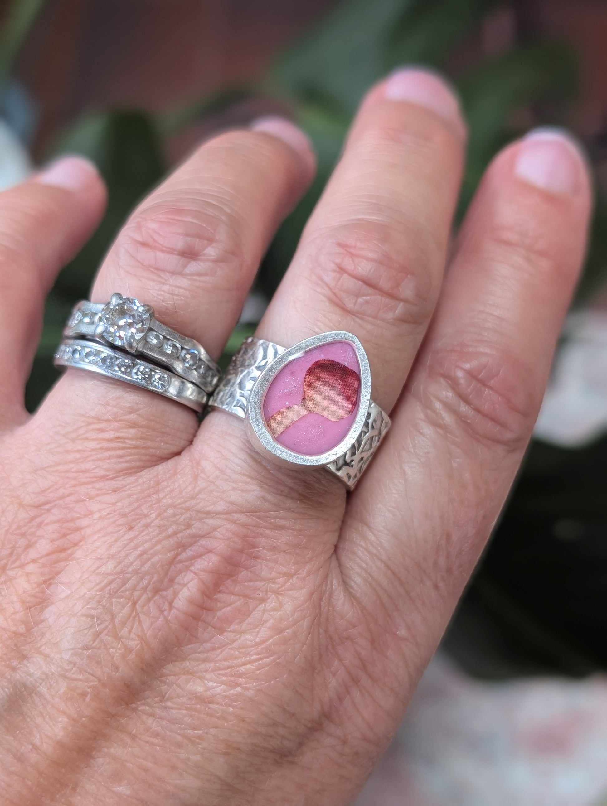 This adjustable ring features a cute little mushroom on a pink ceramic background within a teardrop shaped, silver plated bezel, with a coating of shiny clear resin.