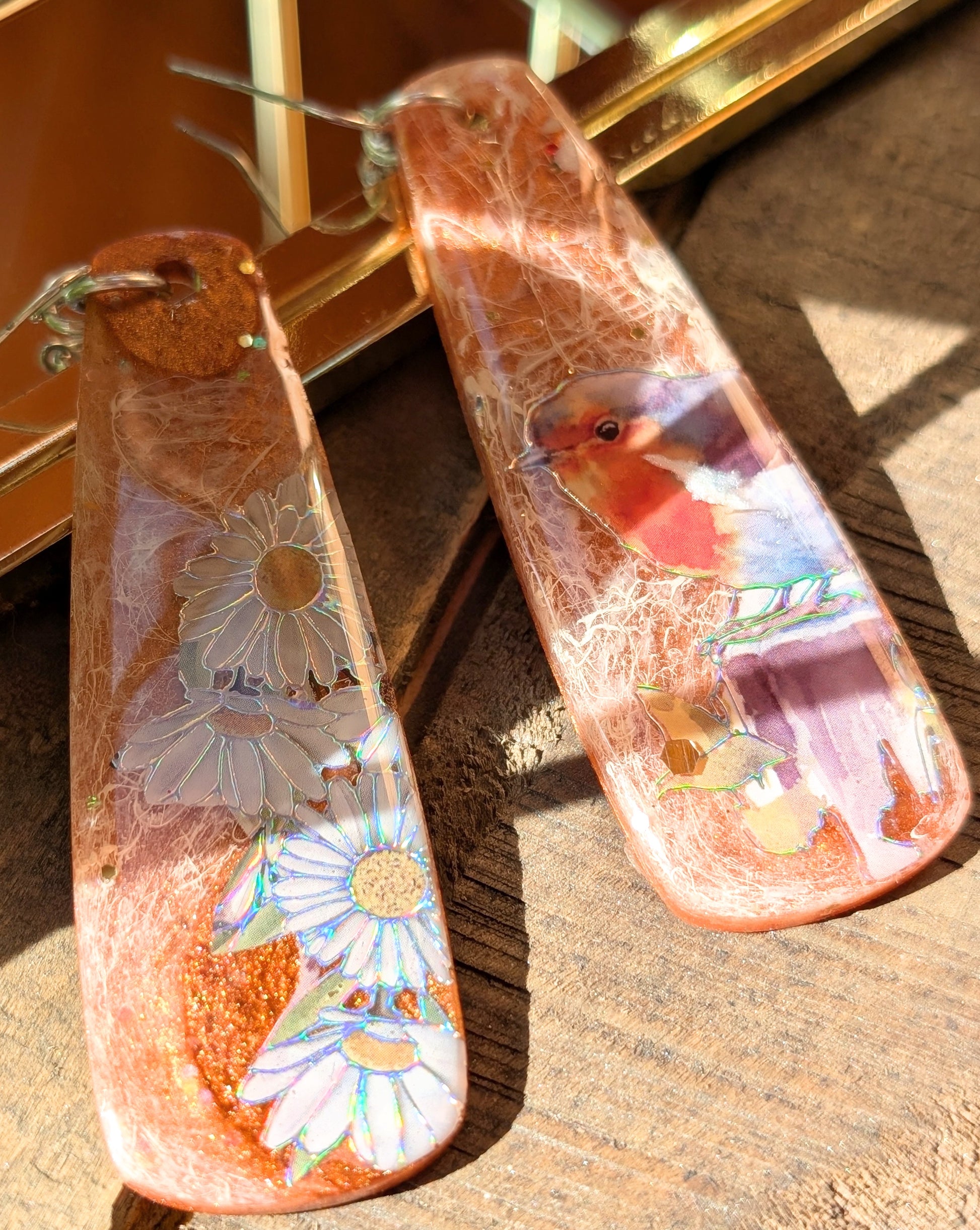 I've made these long, lightweight statement earrings from iridescent coppery- caramel colored resin with drizzles of white, and bold daisy and bird decals, topped with a shiny coat of clear resin.