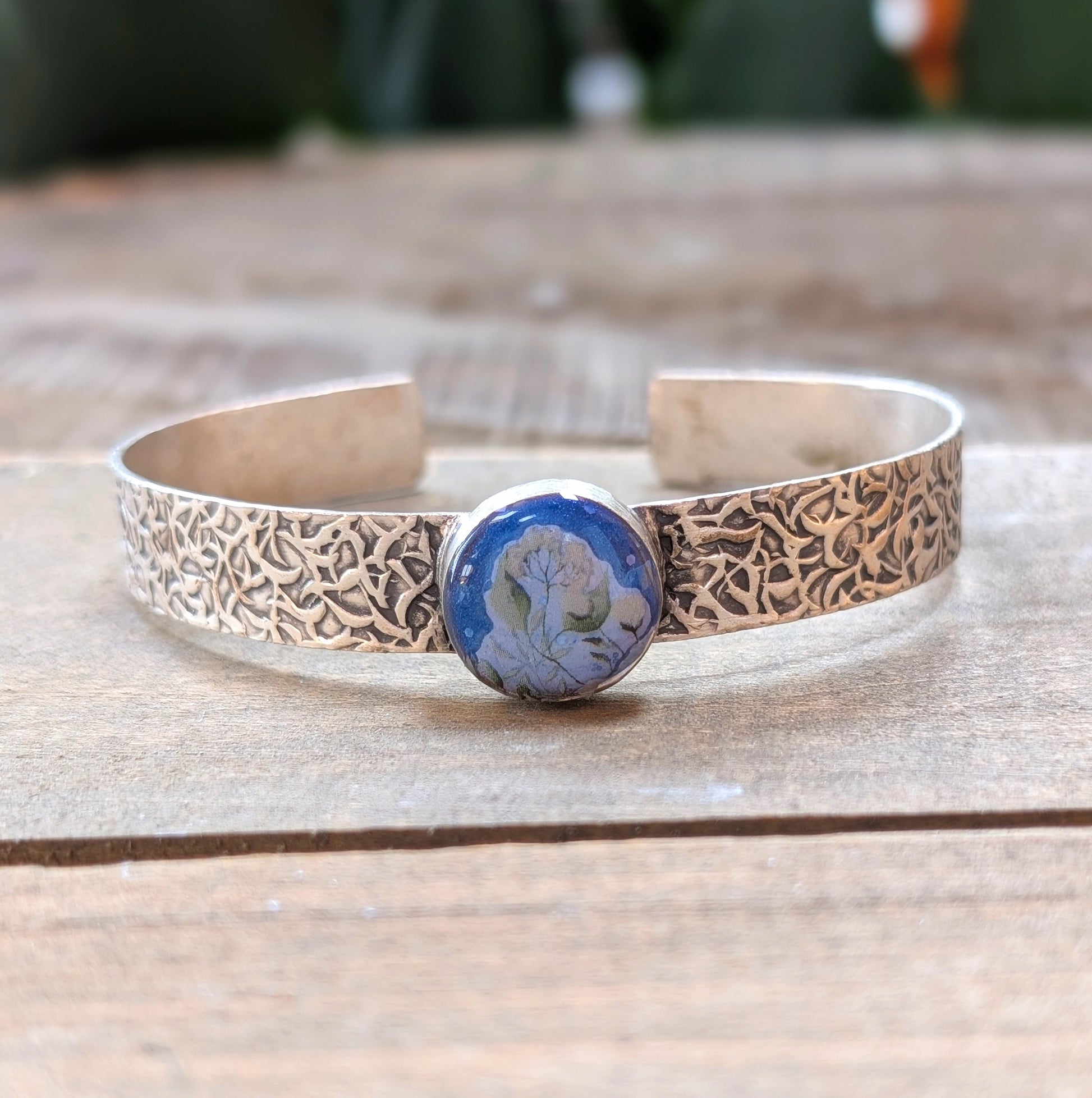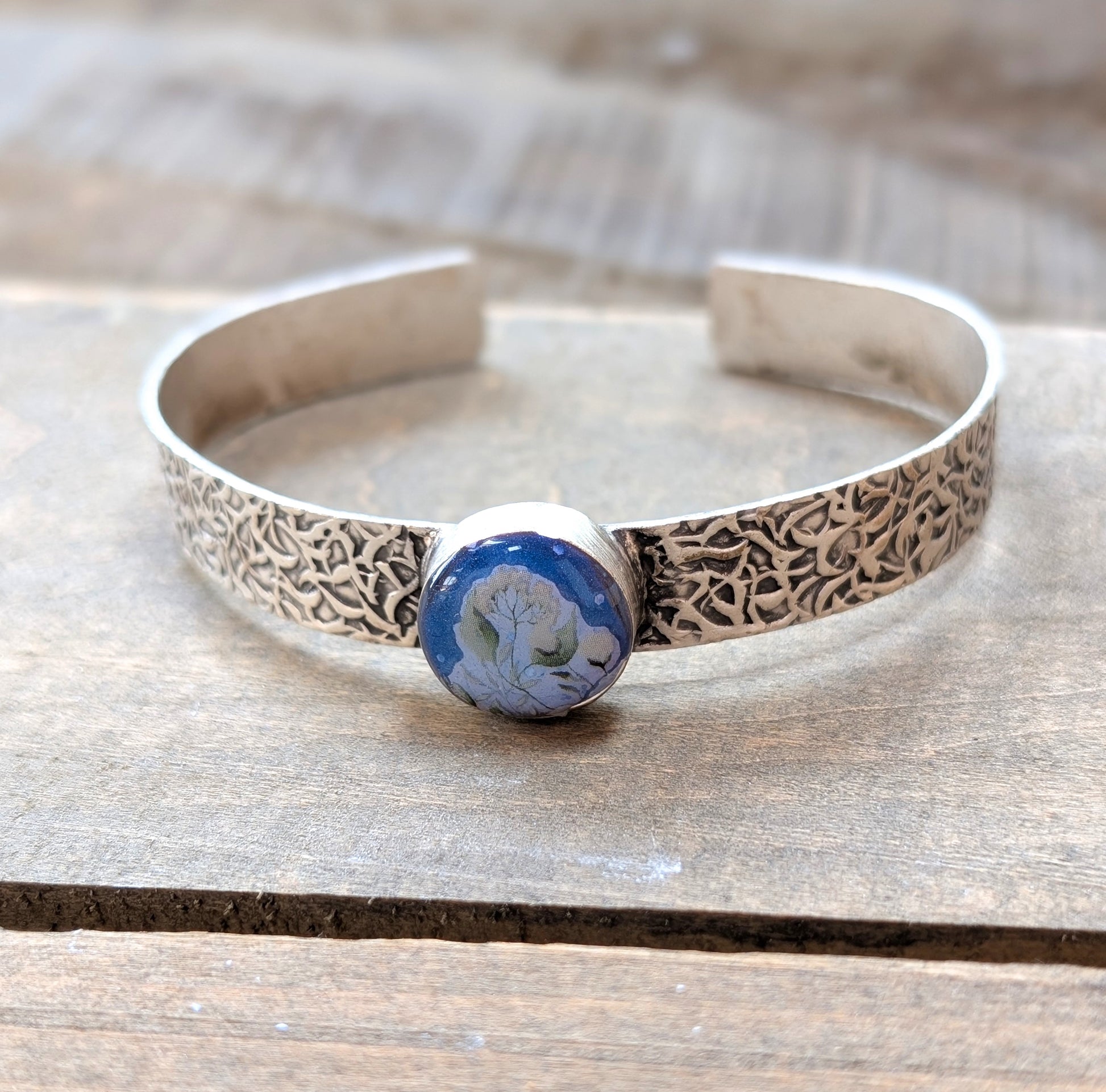 This cuff bracelet features an adjustable silver plated cuff with an antiqued, hammered texture. I've filled the round bezel with denim blue ceramic embellished with a floral decal and topped with shiny clear resin.