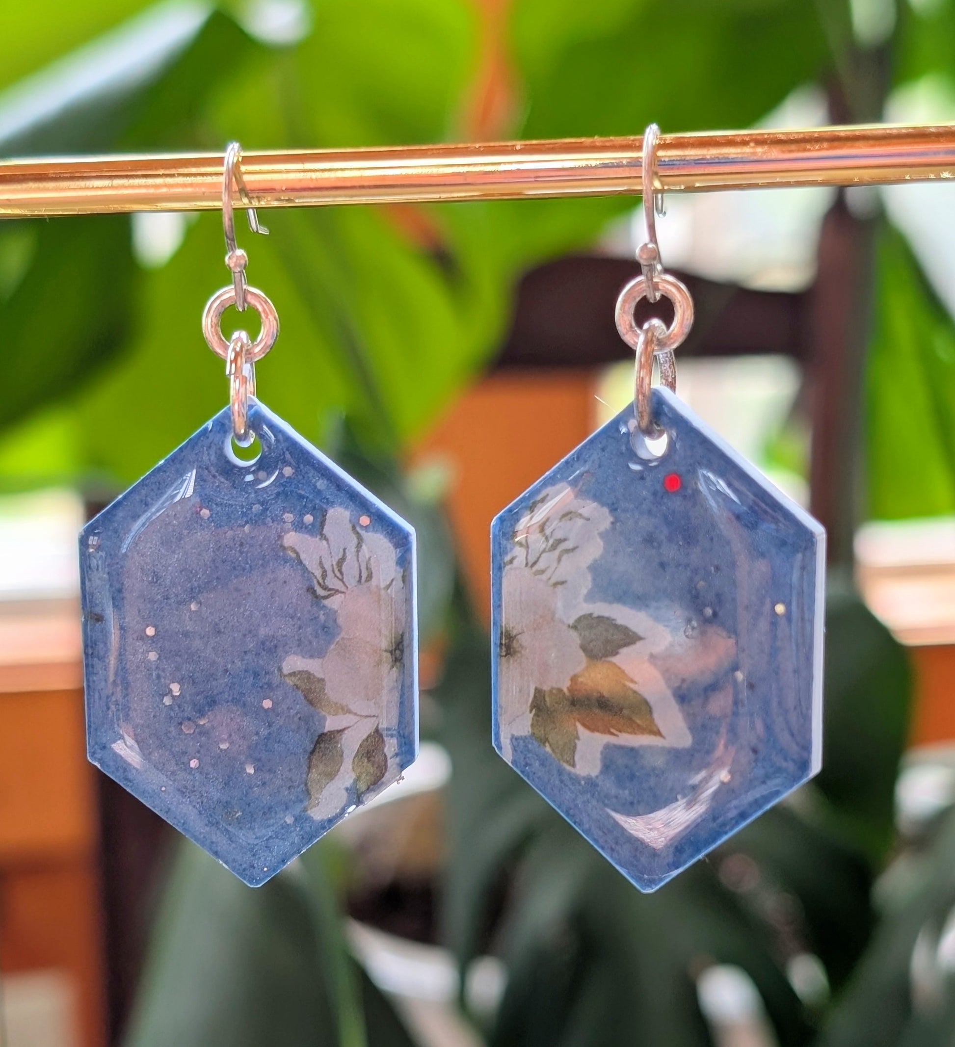 These geometric earrings feature a faded denim blue background, embedded with tiny bits of silver glitter, overlaid with translucent shimmery white, embellished with floral decals, and topped with a shiny coat of clear resin.