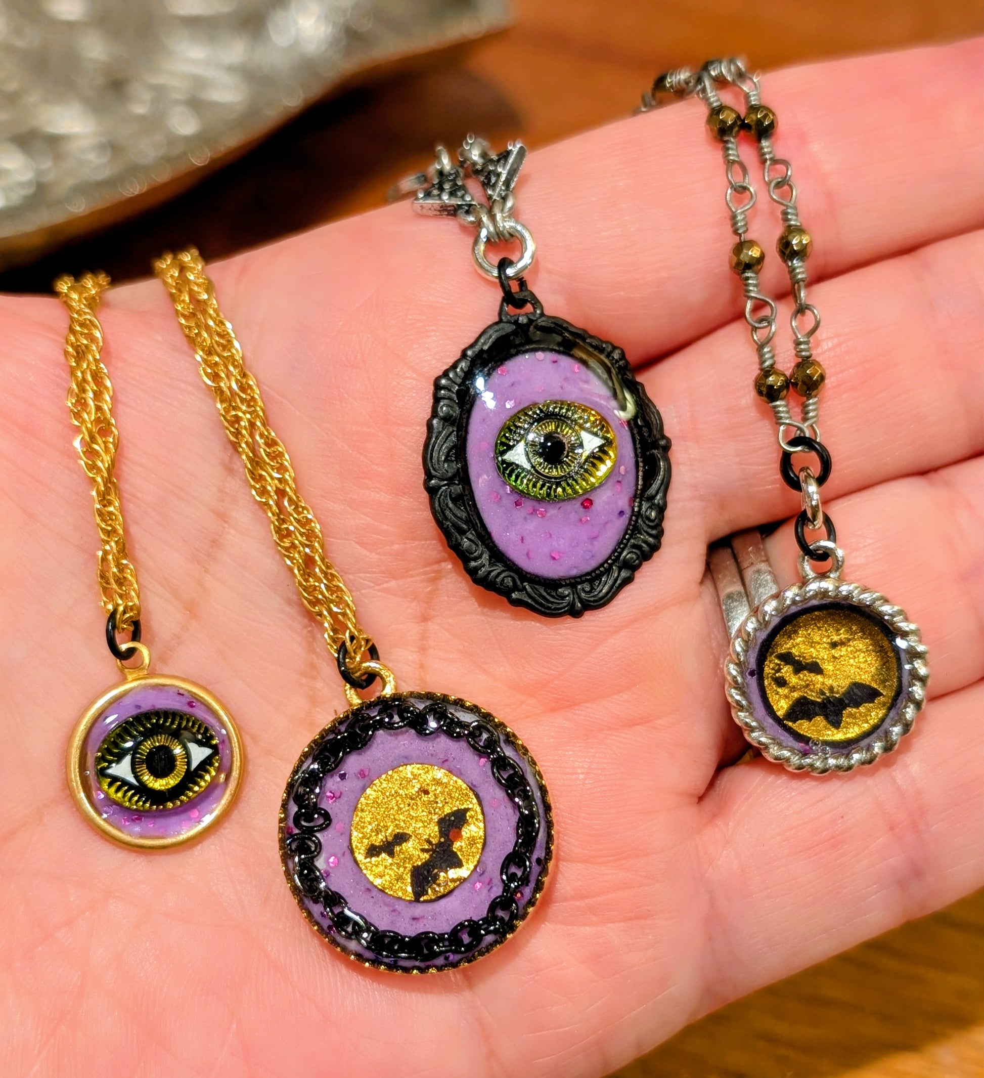 16" silver plated chain with black marcasite details and a little vintage glass eye within an oval black bezel and embedded in purple ceramic and topped with shiny clear resin.