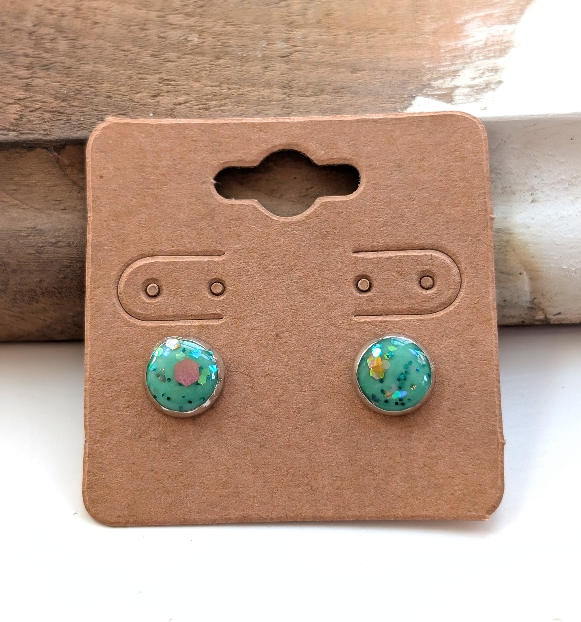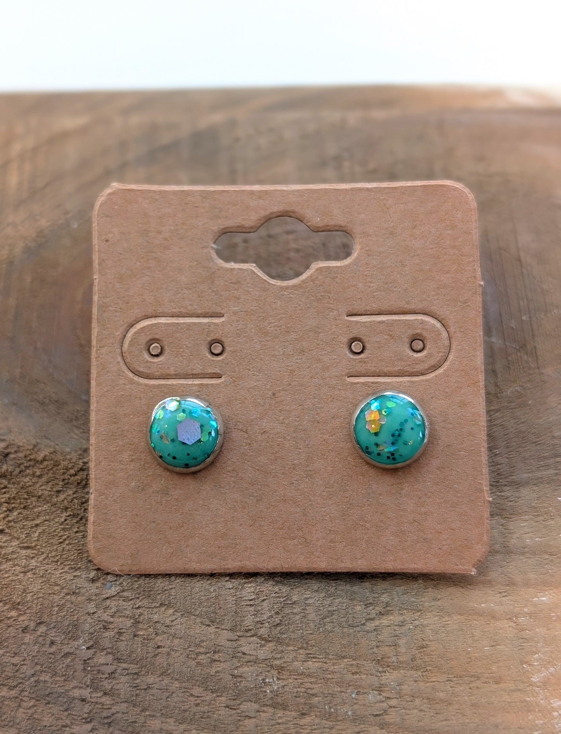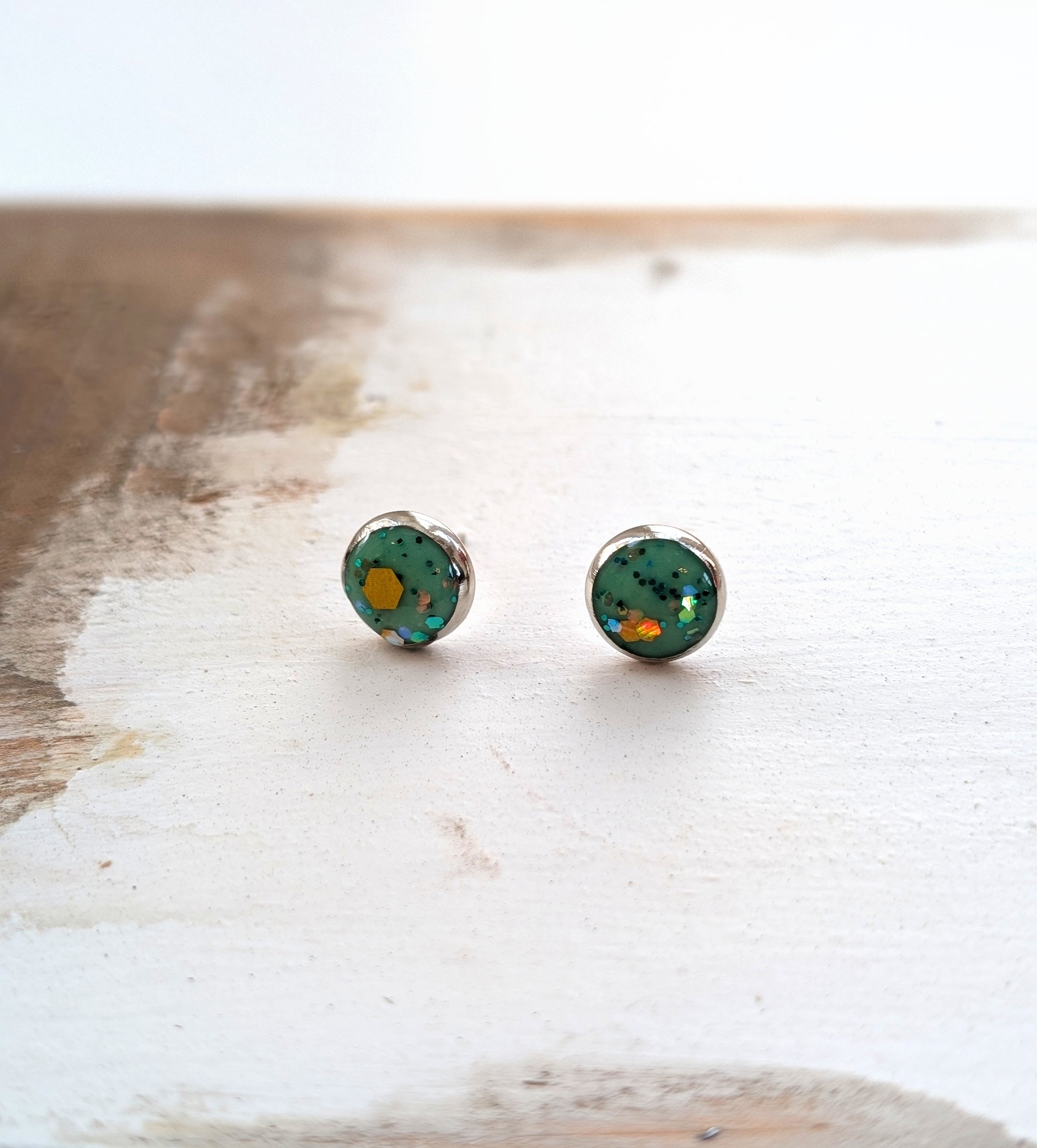 Super sweet little stud earrings in a fresh green color with specks of golden glitter.