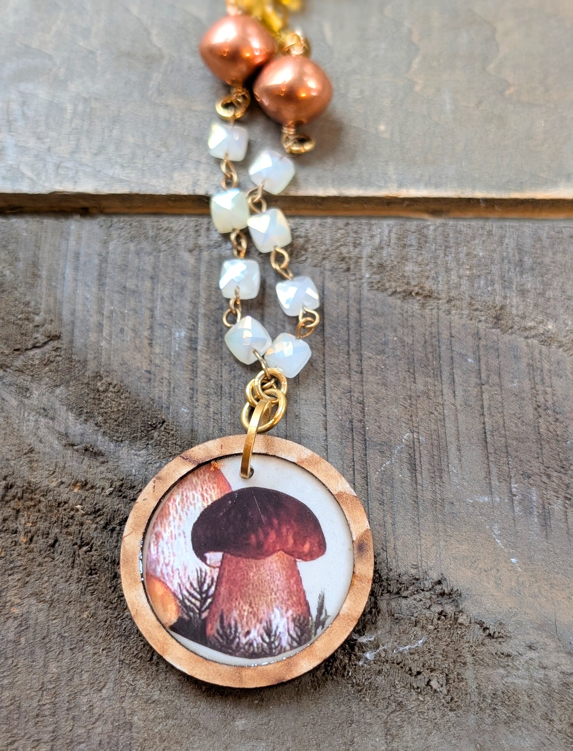 I've made this adorable mushroom pendant necklace from ceramic resin, a mushroom decal, and a clear resin topcoat in a round wood frame. The pendant is attached to a faceted cream vintage chain, vintage copper plated beads, and vintage amber glass beaded chain.