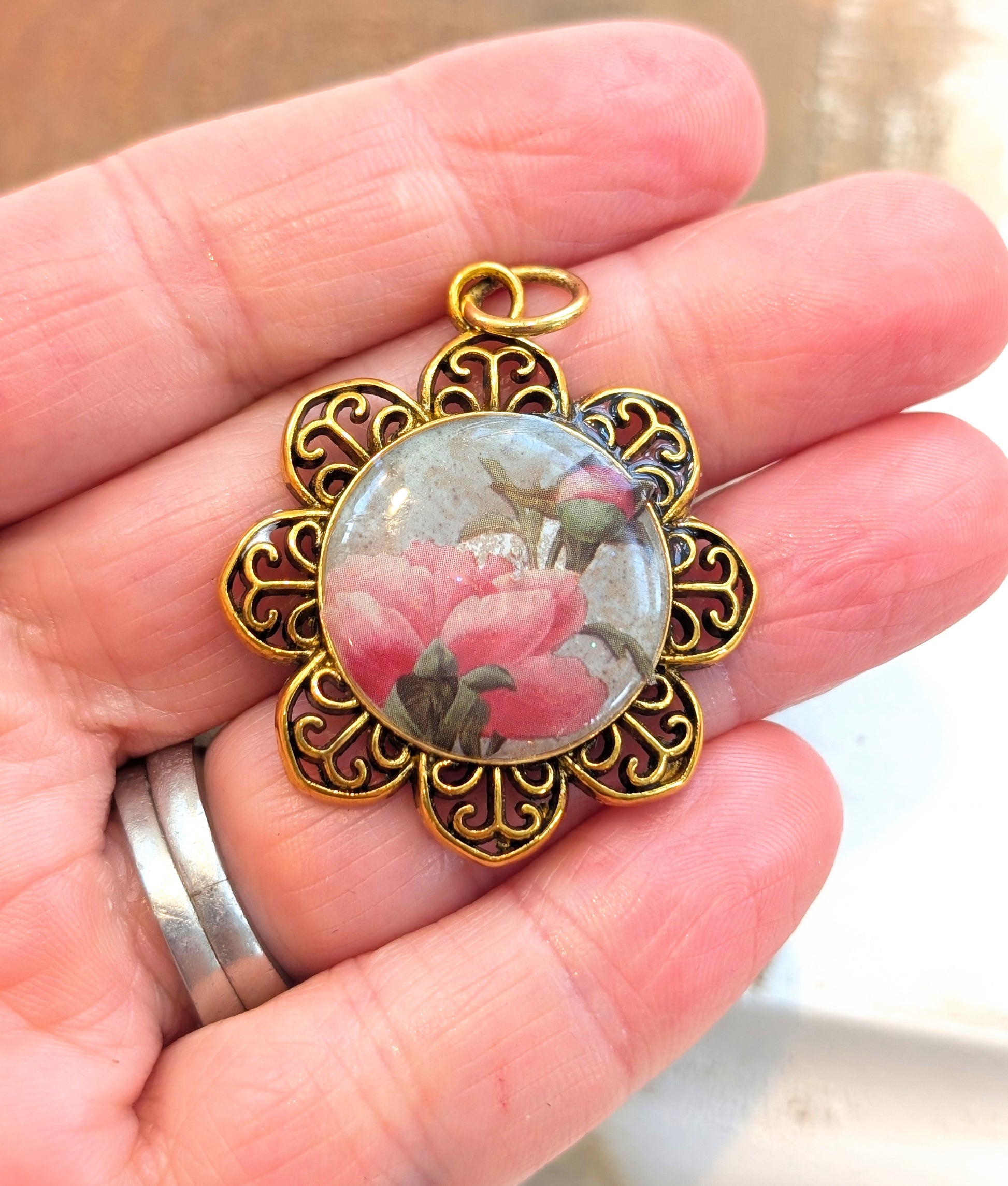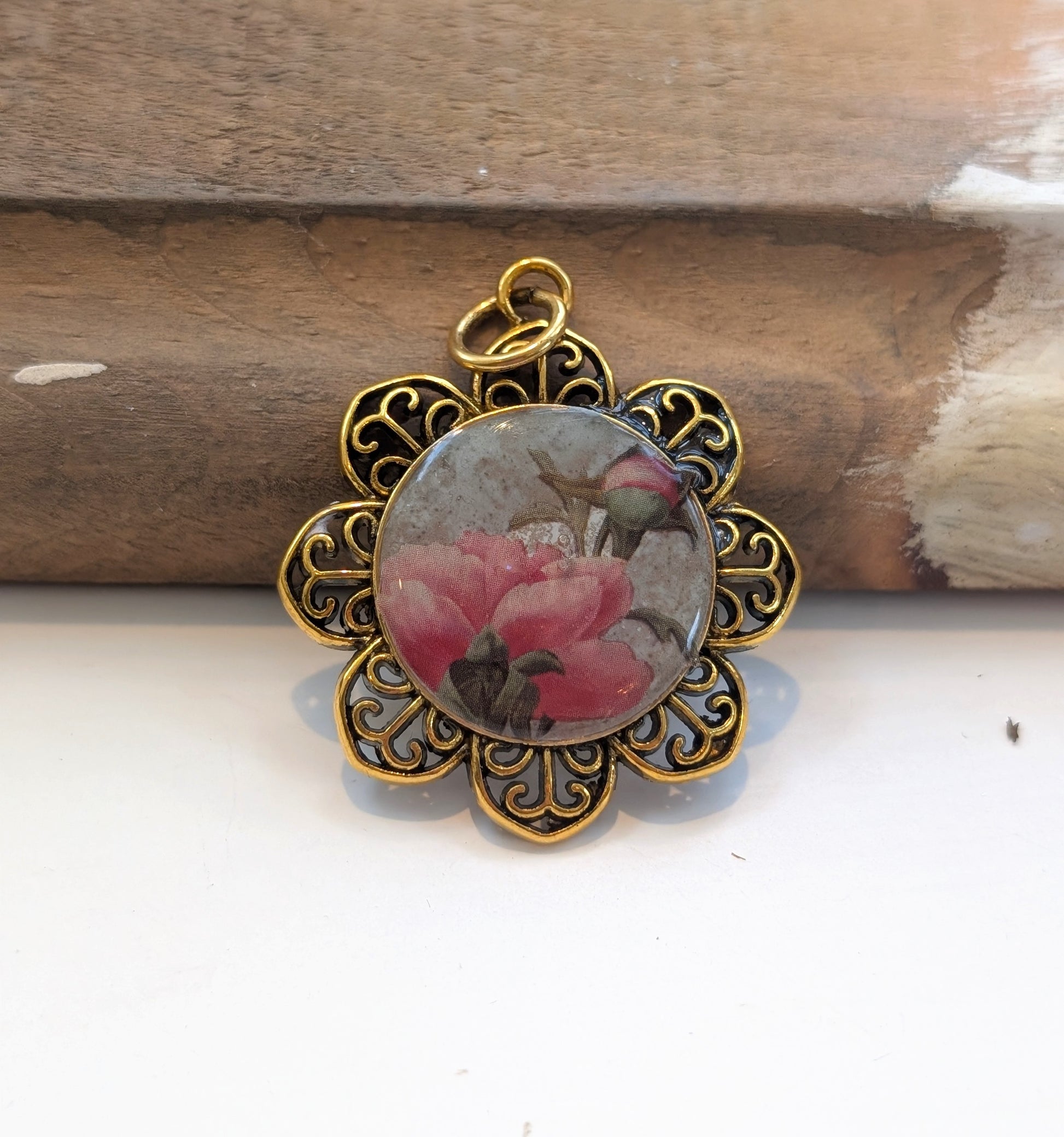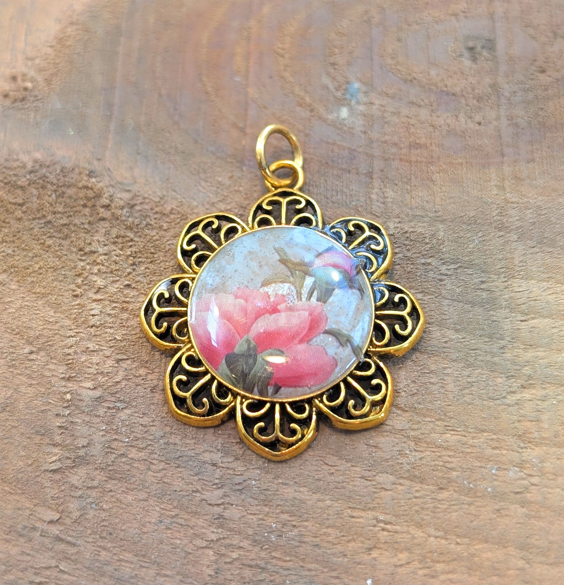 Gold plated floral bezel pendant features a pink flower on a gray ceramic resin background, topped with a shiny clear coat of resin.