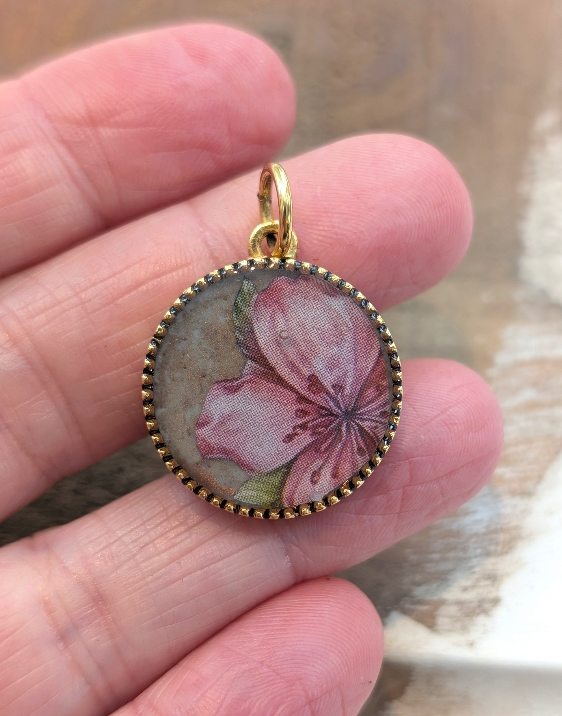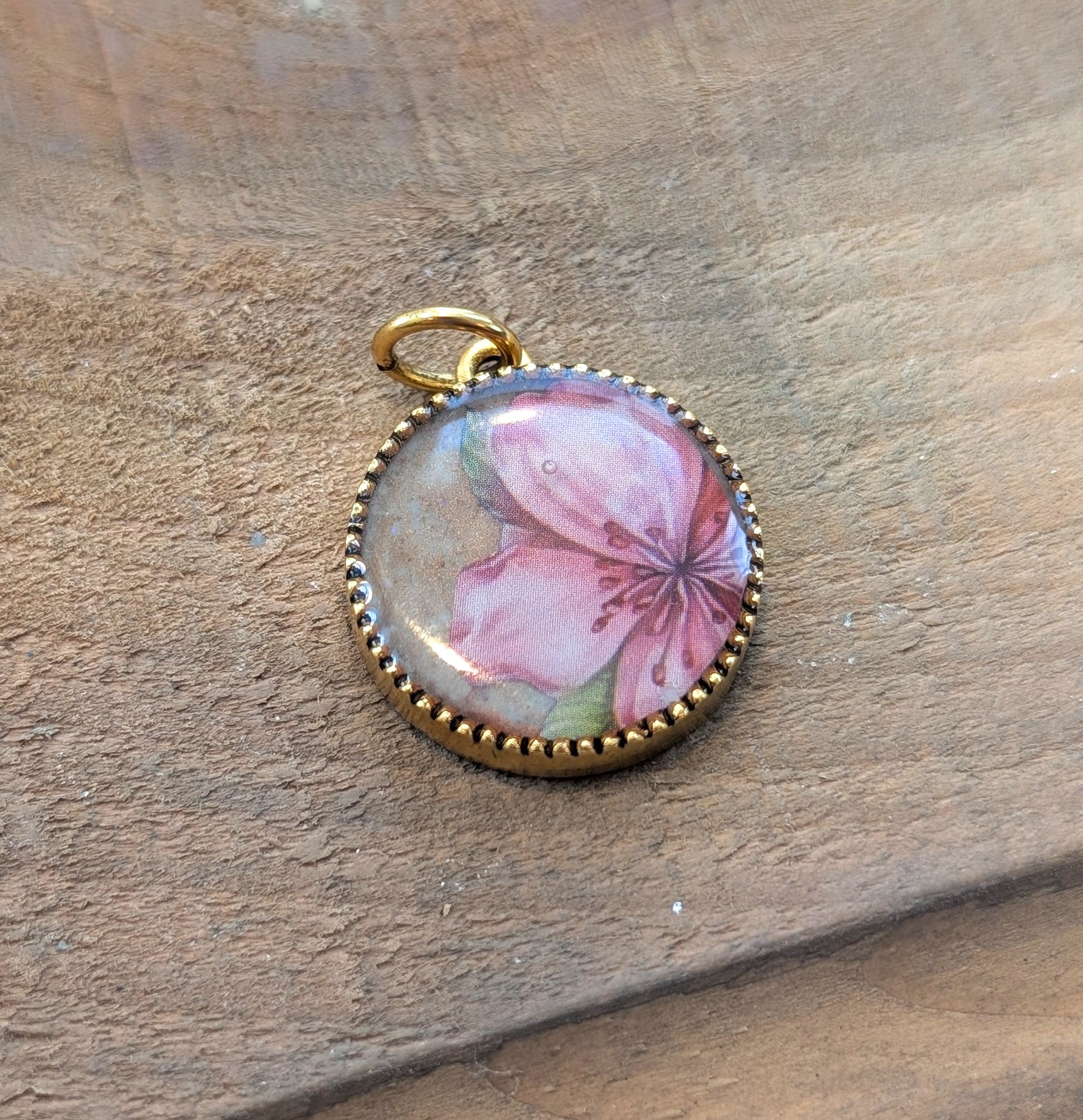 Simple gold plated pendant filled with a beige color ceramic resin, a pink flower decal, and a shiny topcoat of clear resin.