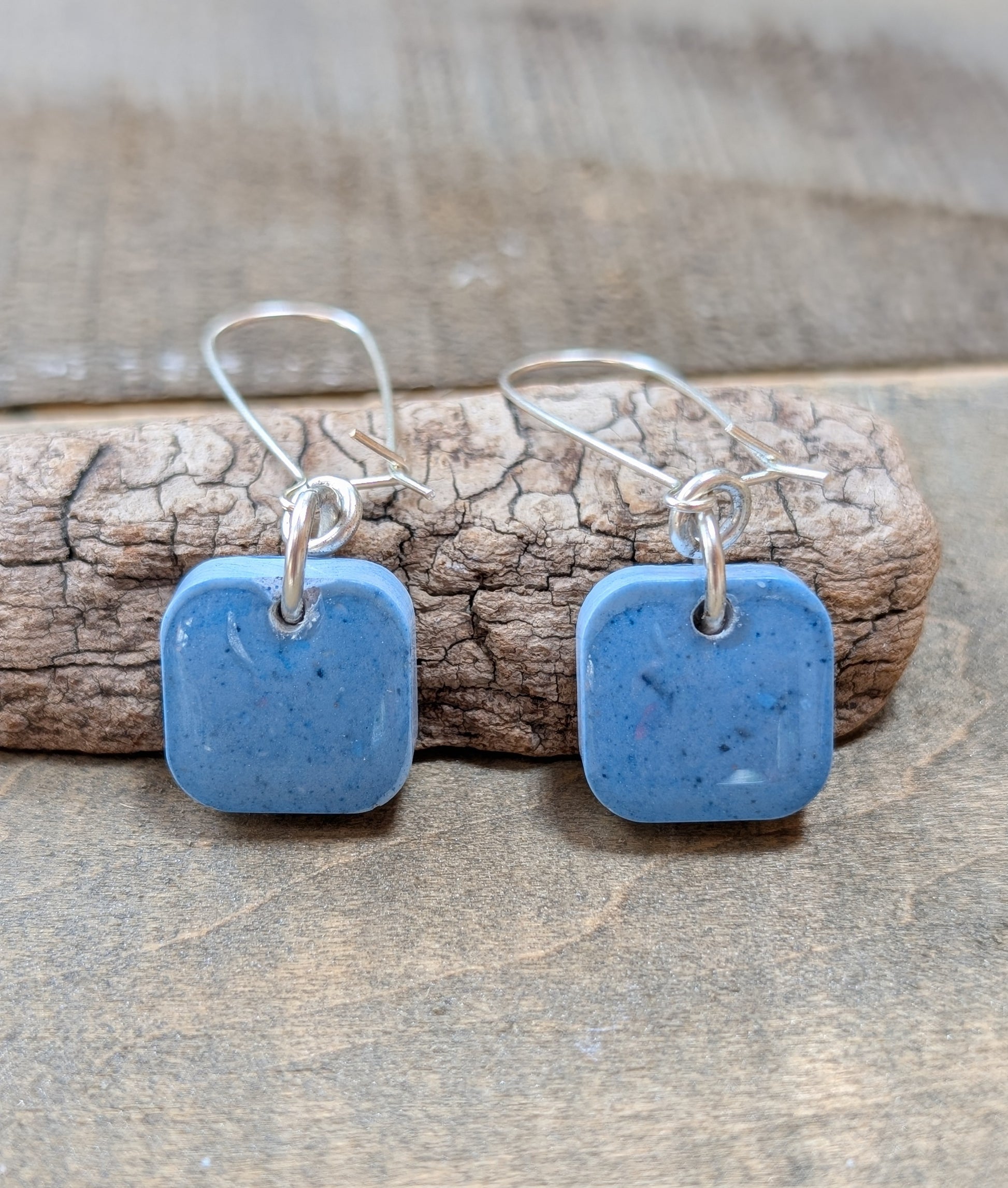 These small square earrings feature a simple, faded denim colored square ceramic charm, topped with a shiny coat of clear resin and finished off with long, kidney shaped, silver plated ear wires.