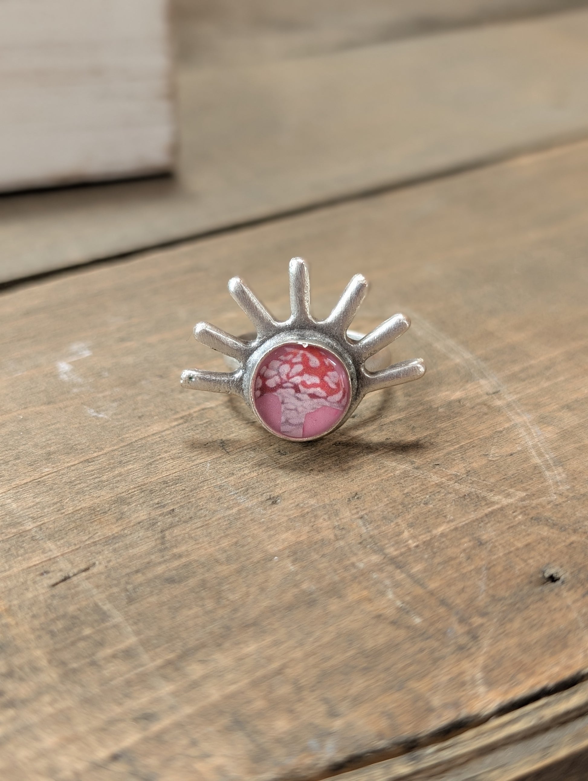 This adjustable ring features a cute red capped and mushroom on a pink ceramic background within a sunburst shaped, silver plated bezel, with a coating of shiny clear resin.
