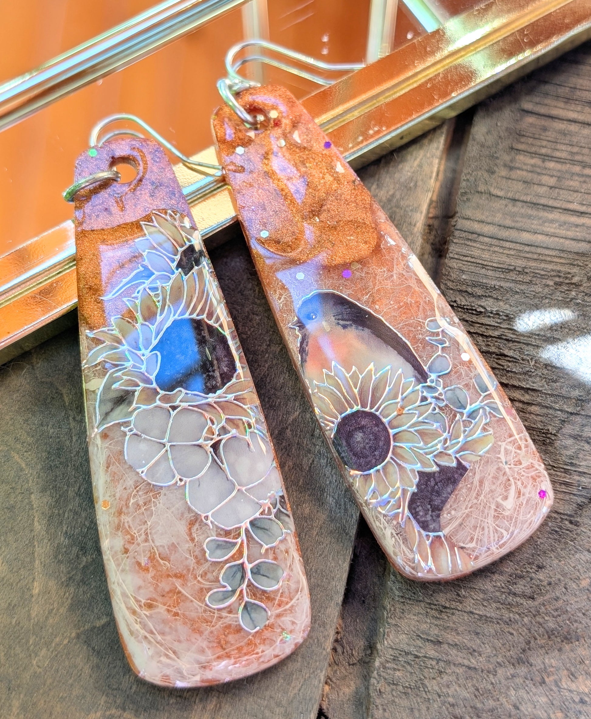 I've made these long, lightweight statement earrings from iridescent coppery- caramel colored resin with a drizzle of white, and bold sunflower and birdie decals, topped with a shiny coat of clear resin.