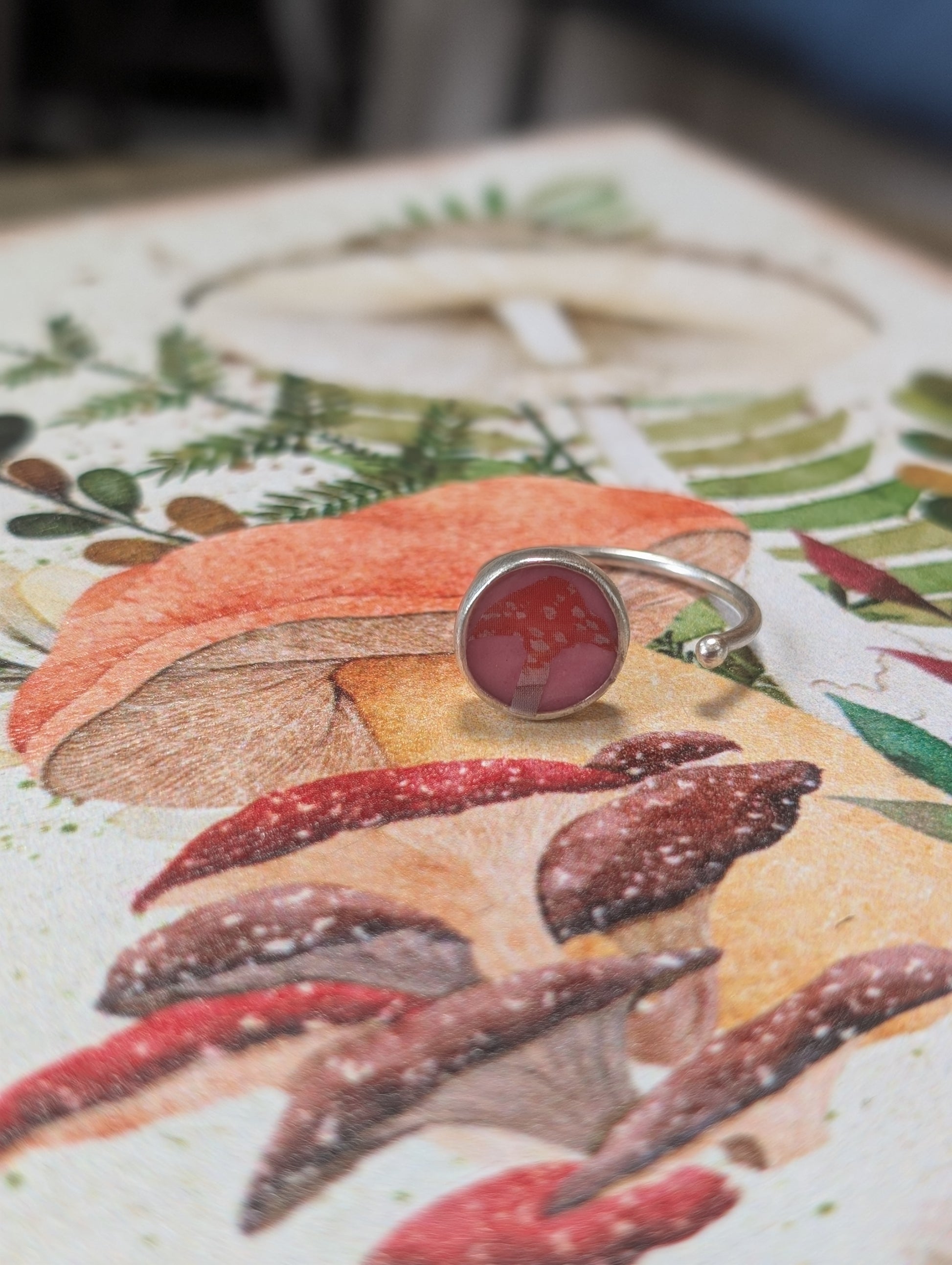 This adjustable ring features a tiny little mushroom on a pink ceramic background within a round, silver plated bezel with a coating of shiny clear resin on top.